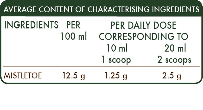 Alcohol-free whole liquid extract obtained from: bi-distilled vegetable glycerine, pure water, mistletoe (Viscum album) herb.