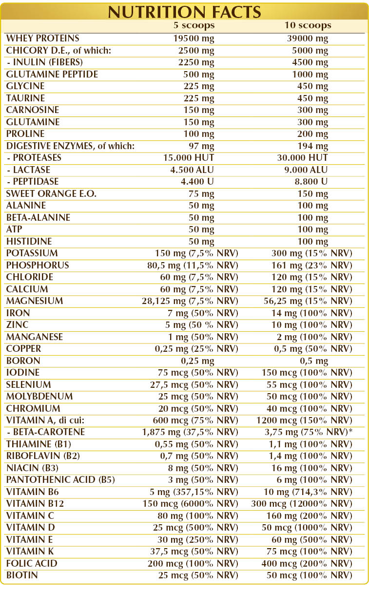 Whey protein, chicory (Cichorium intybus) root D.E. (standardized to 90% inulin), glutamine peptide, calcium glycerophosphate, magnesium glycerophosphate, glycine, potassium citrate, taurine, (L-)carnosine, (L-)glutamine, potassium chloride, (L-)proline; vitamin C (ascorbic acid), natural flavouring: sweet orange (Citrus aurantium var. sinensis or dulcis) fruit peel E.O.; vitamin E (DL-α-tocopheryl acetate), ferrous gluconate, ATP (adenosine triphosphate disodium salt), beta-alanine, (L-)histidine, lactase (100,000 ALU / g), zinc gluconate, protease (500.000 HUT / g), peptidase (200,000 U/g), dunaliella (Dunaliella salina) thallus (algae) D.E. (standardized to 10% beta-carotene), sodium borate, vitamin D3 (colecalciferol 100,000 IU/g), manganese gluconate, vitamin B3 (nicotinamide), activated vitamin B6 (pyridoxal-5-phosphate), vitamin B5 (calcium pantothenate), vitamin A (retinyl acetate); natural-origin sweeteners: steviol glycosides from stevia, thaumatin; copper gluconate, activated vitamin B2 (sodium riboflavin-5-phosphate), vitamin B1 (thiamine hydrochloride), activated folic acid (L-methylfolate calcium), chromium picolinate, activated vitamin B12 (5-deoxyadenosylcobalamin, methylcobalamin), potassium iodide, sodium selenite, sodium molybdate, vitamin K1 (phylloquinone), biotin.