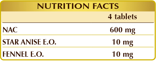 NAC (N-acetylcysteine), microcrystalline cellulose°, gum arabic°, silicon dioxide°°, star anise (Illicium verum) fruit E.O., fennel (Foeniculum vulgare) fruit E.O., plant-based magnesium stearate°°.