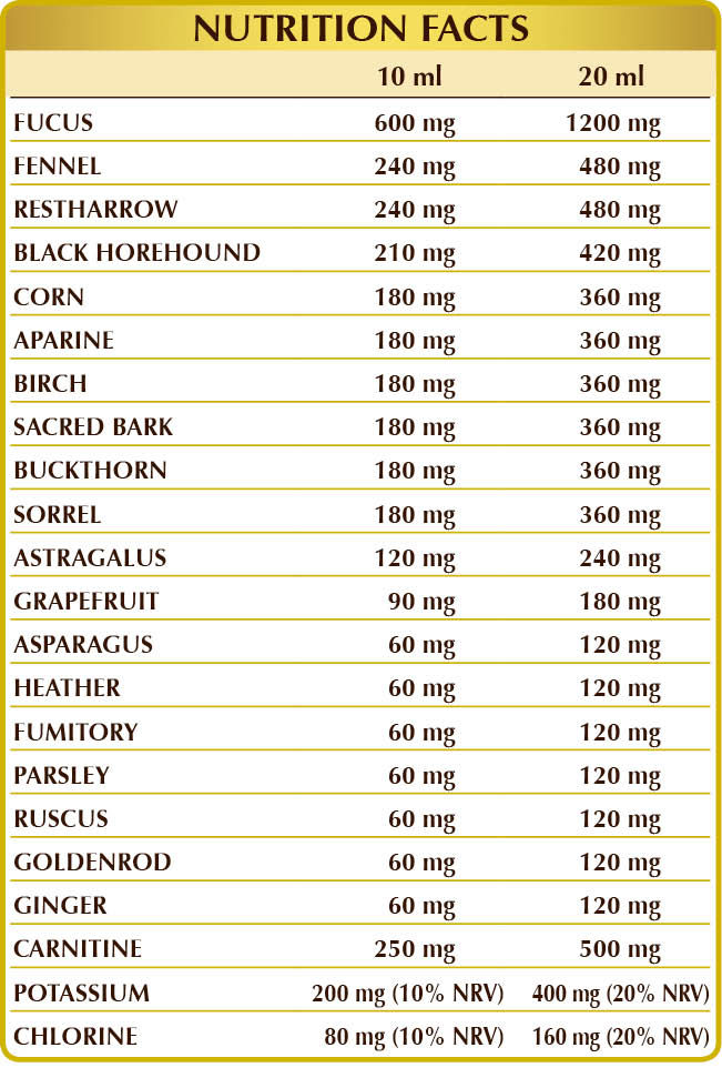 Bidistilled vegetable glycerine, pure water, fucus or sea oak (Fucus vesiculosus) thallus (seaweed) W.L.E., potassium citrate, (L-)carnitine, fennel (Foeniculum vulgare) fruits W.L.E., restharrow (Ononis spinosa) root W.L.E., horehound (Marrubium vulgare) flowering herb W.L.E., corn or maize (Zea mays) stigma W.L.E., cleavers (Galium aparine) flowering herb W.L.E., white birch (Betula alba or pubescens) leaf W.L.E., cascara (Rhamnus purshiana) bark W.L.E., alder buckthorn (Rhamnus frangula) bark W.L.E., yellow dock (Rumex crispus) root W.L.E., potassium chloride W.L.E., astragalus (Astragalus membranaceus) root W.L.E., grapefruit (Citrus paradisi) seed W.L.E., asparagus (Asparagus officinalis) root W.L.E., heather (Calluna vulgaris) flowering herb W.L.E., fumitory (Fumaria officinalis) flowering herb W.L.E., parsely (Petroselinum crispum) root W.L.E., hollyplant or butcher's broom (Ruscus aculeatus) root W.L.E., golden rod (Solidago virga-aurea) flowering herb W.L.E., ginger (Zingiber officinalis) rhizome W.L.E..