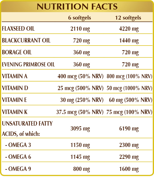 Flax (Linum usitatissimum) seed oil, blackcurrant (Ribes nigrum) seed oil, borage (Borago officinalis) seed oil, evening primrose (Oenothera biennis) seed oil, natural vitamin E (D-α-tocopherol), vitamin A (retinyl palmitate), vitamin K1 (phylloquinone), vitamin D3 (cholecalciferol); excipients (softgels): edible gelatin and glycerine.