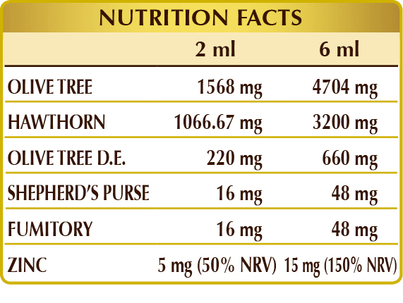 Pure water, wine ethyl alcohol (Alcoolvis® = alcohol purified by a method developed by Dr Giorgini), olive tree (Olea europaea) leaf W.L.E., hawthorn (Crataegus oxyacantha) flower and leaf W.L.E., olive tree (Olea europaea) leaf D.E. (standardized to 40% oleuropein), zinc gluconate, shepherd's purse (Capsella bursa-pastoris) herb W.L.E., fumitory (Fumaria officinalis) flowering herb W.L.E.