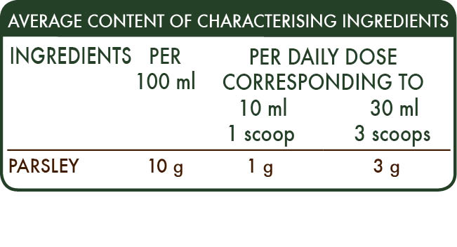 Alcohol-free whole liquid extract obtained from: bi-distilled vegetable glycerine, pure water, parsley (Petroselinum crispum) fruits.
