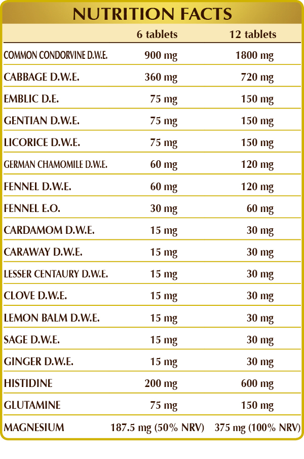 Common condorvine (Marsdenia condurango) tree bark D.W.E., cabbage (Brassica oleracea var. Capitata) leaf D.W.E., (L-)histidine, magnesium oxide, magnesium carbonate, magnesium trisilicate°°, microcrystalline cellulose°, gum Arabic°, emblic (Phyllanthus emblica) fruit D.E. (standardized to 30% tannins), gentian (Gentiana lutea) root D.W.E., (L-)glutamine, licorice (Glycyrrhiza glabra) root D.W.E., chamomile (Matricaria chamomilla) flower head D.E., fennel (Foeniculum vulgare) fruit D.W.E., fennel (Foeniculum vulgare) fruit E.O., cardamom (Elettaria cardamomum) seed D.W.E., caraway or meadow cumin (Carum carvi) fruit D.W.E., common centaury (Centaurium erythraea) top D.W.E., clove (Eugenia caryophyllata) floral bud D.W.E., lemon balm (Melissa officinalis) leaf D.W.E., sage (Salvia officinalis) leaf D.W.E., ginger (Zingiber officinalis) rhizome D.W.E., plant-based magnesium stearate°°.