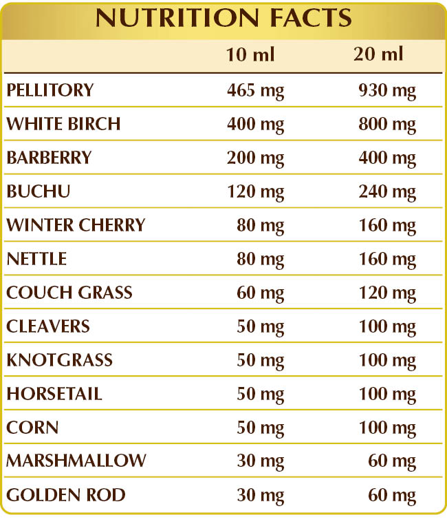 Pellitory, white birch, buchu, nettle, couch grass, aparine, horsetail, corn and goldenrod help maintain normal urinary tract functions and, in combination with scurvy grass, support body fluid drainage. Moreover, pellitory, white birch, nettle and cleavers help keep normal body's cleansing functions.
