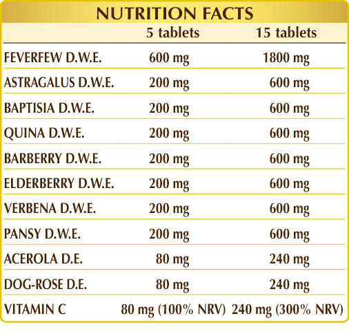 Astragalus, baptisia and acerola support the body's natural defences. Chinchona and elder regulate perspiration and feverfew counteracts local muscle and joint stiffness. In addition, baptisia maintain healthy nose and throat, whereas chiretta and elderberry support upper respiratory tract functions. It contains a high level of vitamin C, useful for normal immune system function.