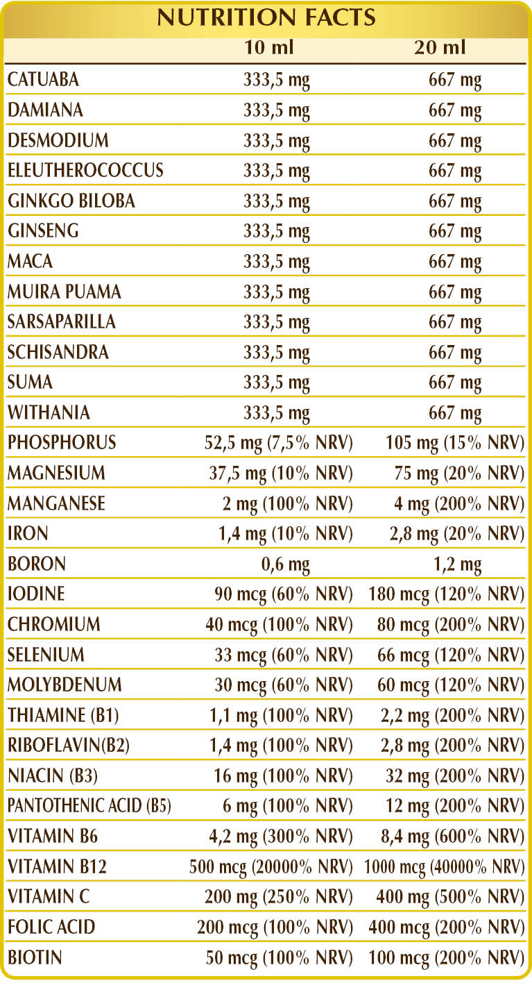 Bistilled vegetable glycerin, pure water, catuaba (Erythroxylum catuaba) bark W.L.E., damiana (Turnera diffusa) leaf W.L.E., desmodium (Desmodium adscendens) leaf W.L.E., eleuthero or Siberian ginseng (Eleutherococcus senticosus) root W.L.E., ginkgo biloba (Ginkgo biloba) leaf W.L.E., ginseng (Panax ginseng) root W.L.E., maca or Peruvian ginseng (Lepidium meyenii) root W.L.E., muira puama (Ptychopetalum olacoides) wood W.L.E., sarsaparilla (Smilax medica) root W.L.E., schisandra (Schisandra chinensis) fruit W.L.E., suma or Brazilian ginseng (Pfaffia paniculata) root W.L.E., withania or ashwagandha or Indian ginseng (Withania somnifera) root W.L.E., magnesium glycerophosphate, vitamin C (sodium ascorbate), manganese gluconate, vitamin B3 (inositol hexanicotinate and nicotinamide), ammonium ferric citrate; natural-origin sweeteners: steviol glycosides from stevia, thaumatin; vitamin B5 (calcium pantothenate), activated vitamin B6 (pyridoxal-5-phosphate), sodium borate, activated vitamin B2 (riboflavin-5-phosphate sodium), vitamin B1 (thiamine hydrochloride), activated vitamin B12 (5-deoxyadenosylcobalamin, methylcobalamin), chromium chloride, activated folic acid (L-methylfolate calcium), potassium iodide, sodium selenite, sodium molybdate, biotin.