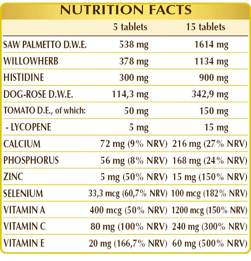 Serenoa or saw palmetto (Serenoa repens or Sabal serrulata) fruit D.W.E., fireweed (Epilobium parviflorum) herb D.W.E., gum arabic°, microcrystalline cellulose°, microcrystalline cellulose, (L-)Histidine, dog rose (Rosa canina) fruit D.W.E. (standardized to 70% vitamin C), silicon dioxide°°, tomato (Solanum lycopersicum) fruit D.E. standardized to 10% lycopene), plant-derived magnesium stearate°°, plant-derived vitamin E (D-α-tocopherol acetate), zinc gluconate, vitamin A (retinyl acetate), sodium selenite. °Bulking agent °°Anti-caking agent
