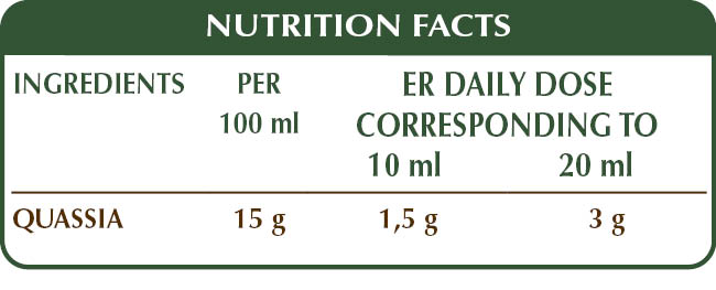 Alcohol-free whole liquid extract obtained from: bi-distilled vegetable glycerine, pure water, bitter ash (Quassia amara) wood.