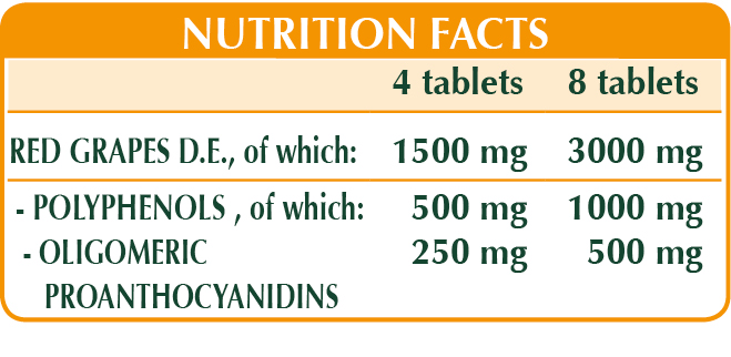 Supplement based on red grape extract that has an antioxidant action, supports normal function of the cardiovascular system and promotes microcirculation by counteracting heaviness in the legs.
