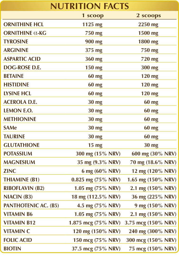 Corn or rice maltodextrin, (L-)ornithine HCL hydrochloride, (L-)tyrosine, potassium citrate, (L-)ornithine α-ketoglutarate (OKG), dextrose, (L-)arginine, (L-)aspartic acid, magnesium dibasic citrate, dog rose (Rosa canina) D.E. (standardized to 70% vitamin C), lemon (Citrus limon) fruit D.J., potassium gluconate; acidity regulator: citric acid; magnesium pidolate, magnesium gluconate, betaine, (L-)lysine HCL hydrochloride, (L-)histidine, SAMe (S-adenosylmethionine disulfate tosylate), zinc gluconate, acerola (Malpighia glabraa) fruit D.E. (standardized to 50% vitamin C), lemon (Citrus limon) fruit peels essential oil, (L-)methionine, taurine, vitamin B3 (nicotinamide), reduced glutathione, vitamin B5 (calcium pantothenate); natural sweeteners: steviol glycosides from stevia, thaumatin; activated vitamin B2 (riboflavin 5-phosphate sodium), activated vitamin B6 (pyridoxal-5-phosphate), vitamin B1 (thiamine hydrochloride), activated folic acid (L-methylfolate calcium), biotin, activated vitamin B12 (5-deoxyadenosylcobalamin, methylcobalamin).