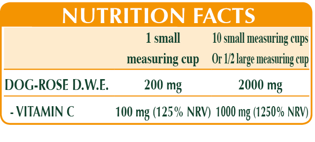 Rose Hip can perform a support and reinvigorating action, is naturally rich in vitamin C, which has many properties: it promotes energy metabolism, reducing tiredness and fatigue; protects cells from oxidative stress and regenerates the reduced form of vitamin E; contributes to normal function of the immune system, the nervous system and the psychological function. It also supports collagen formation while helping maintain normal function of blood vessels, bones, cartilage, skin, teeth and gums; it increases iron absorption.