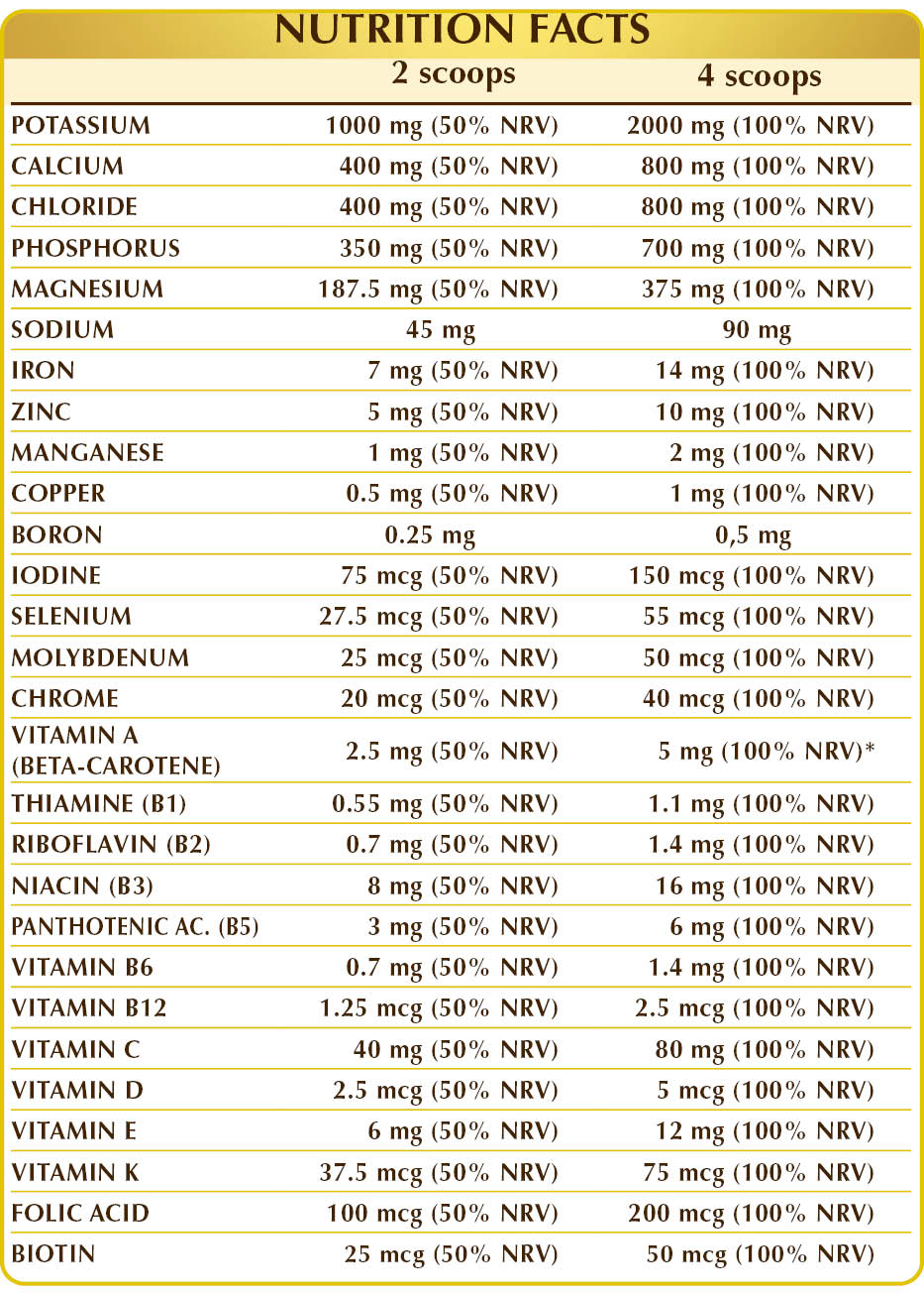 * Amounts of beta-carotene corresponding to 100% NRV as retinol equivalent. NRV = Nutrient Reference Value D.E.= Dry Extract D.J. = Dehydrated Juice