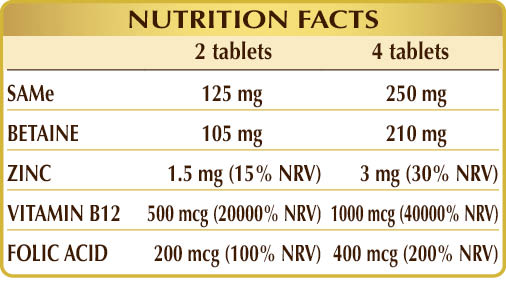 Food supplement made from SAMe (S-adenosyl methionine), enriched with betaine and other nutrients. In particular, SAMe is a molecule naturally present in the human body and mostly produced by the liver. Vitamin B12 supports the functioning of the nervous system and, together with folic acid, contributes to the normal metabolism of homocysteine and normal psychological function.