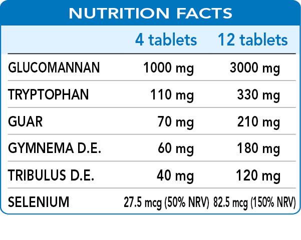 Glucomannan contributes to weight loss* whereas guar gum enhances satiety and reduces the absorption of nutrients. Gymnema promotes carbohydrate metabolism and improve lipid metabolism while helping stave off hunger pangs. Finally, puncturevine has a tonic action that is useful for combating physical and mental fatigue, while selenium promotes normal spermatogenesis.