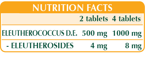 Eleutherococcus or Siberian ginseng (Eleutherococcus senticosus) root D.E. (standardized to 0.8% eleutherosides B+E), corn- or rice-based maltodextrins, microcrystalline cellulose°, gum arabic°, silicon dioxide°°, plant-based magnesium stearate°°.