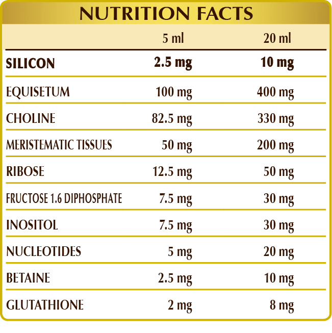 Bidistilled vegetable glycerine, pure water, choline-stabilized orthosilicic acid (Si 1%), equisetum or horsetail (Equisetum arvense) herb W.L.E., equisetum or horsetail (Equisetum arvense) glyceric macerate of meristematic tissues or fresh buds, ribose, fructose 1.6 diphosphate; acidity regulator: citric acid; inositol, betaine citrate, choline tartrate; nucleotide mix: AMP (adenosine monophosphate), CMP (cytosine monophosphate), GMP (guanosine monophosphate), UMP (uridine monophosphate); glutathione; natural sweetener: thaumatin (E957). Sweetened only with natural sweeteners.