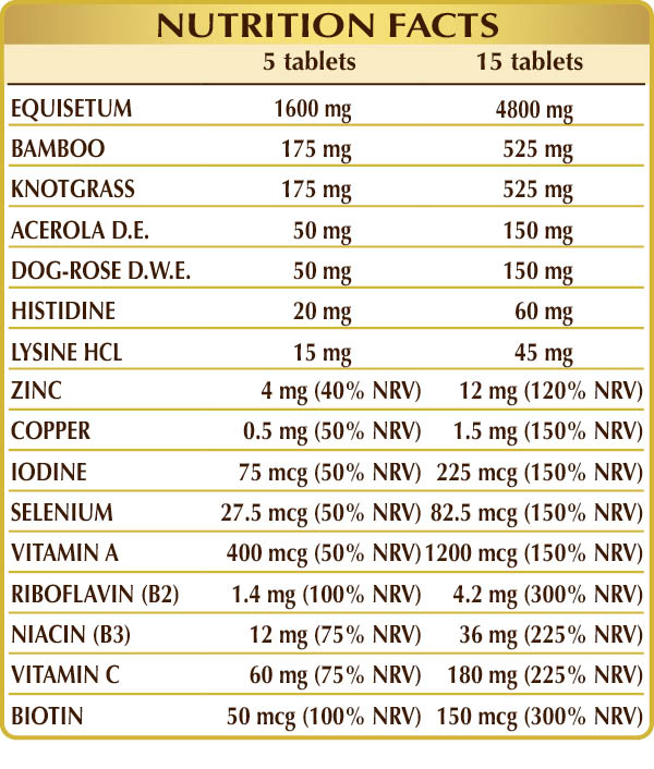 Horsetail and bamboo support healthy hair and nails. Horsetail can also promote the connective tissue trophism, the drainage of body fluids and the urinary tract function. Furthermore, bamboo and knotgrass improve the digestive system function. Enriched with vitamins and minerals for healthy hair (zinc, copper, selenium, biotin) and skin (zinc, copper, iodine, vitamin A, vitamin C and biotin). In particular, vitamin C contributes to the production of collagen necessary for the normal function of bone, cartilage, gums, teeth, and blood vessels.