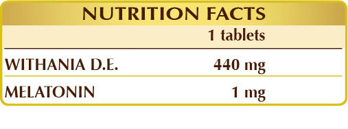 Withania or Indian Ginseng (Withania somnifera) root D.E. (standardized with 2.5% in withanolides), microcrystalline cellulose°, gum arabic°, silicon dioxide°°, plant-based magnesium stearate°°, melatonin.