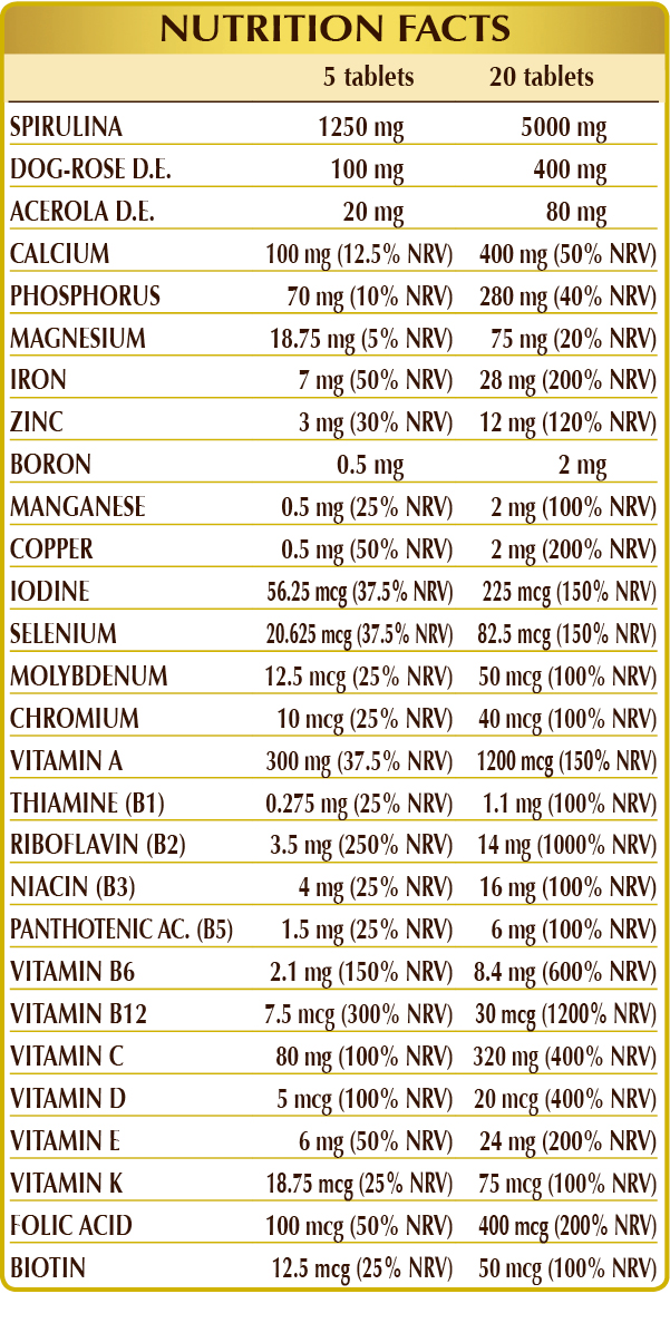 Spirulina (Spirulina maxima) single-celled algae, dibasic calcium phosphate, microcrystalline cellulose°, gum arabic°, dog rose (Rosa canina) fruit D.W.E. (titrated to 70% vitamin C), ferrous gluconate, calcium carbonate, magnesium glycerophosphate, magnesium oxide, silicon dioxide°°, zinc gluconate, acerola (Malpighia glabra) fruit D.E. (titrated to 50% vitamin C), vegetable-derived vitamin E (D-α-tocopherol acetate), plant-based magnesium stearate°°, activated vitamin B2 (sodium riboflavin-5-phosphate), borax, manganese gluconate, vitamin B3 (niacinamide), activated vitamin B6 (pyridoxal-5-phosphate), vitamin A (retinyl acetate), lichen (Cladonia rangiferina) thallus D.E. (titrated to vitamin D3 (cholecalciferol 100,000 IU/g), copper sulfate, vitamin B5 (calcium pantothenate), vitamin B1 (thiamine hydrochloride), activated folic acid (calcium L-methylfolate), chromium picolinate, potassium iodide, sodium selenite, sodium molybdate, vitamin K1 (phylloquinone), biotin, activated vitamin B12 (5-deoxyadenosylcobalamin, methylcobalamin). °Bulking agent.°°Anti-caking agent.
