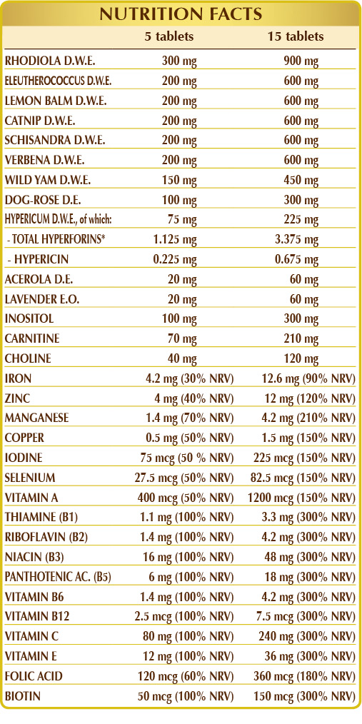 Food supplement made from herbs, minerals, vitamins, and other nutrients. Golden root, eleutherococcus or Siberian ginseng and schisandra have a tonic-adaptogenic effect, which helps fight off physical and mental fatigue. Lemon balm, catnip, vervain and St. John's wort, promoting relaxation and mental well-being, can help deal with stress. Vitamins B1, B3, B6, B12, C and biotin contribute to keeping normal psychological function. Moreover, iron, vitamins B3, B5, B6, B12, C and folic acid reduce tiredness and fatigue.
