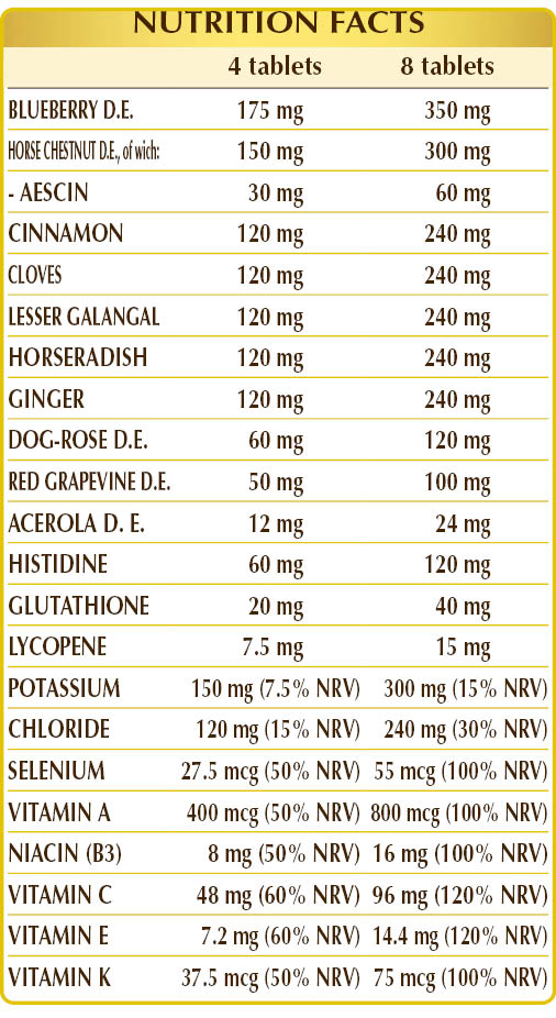 Potassium chloride, microcrystalline cellulose°, gum arabic°, blueberry (Vaccinium myrtillus) fruit D.E. (titrated to 25% anthocyanosides), horse chestnut (Aesculus hippocastanum) bark D.E. (titrated to 20% aescin), cinnamon (Cinnamomum zeylanicum) bark Pulv., clove (Eugenia caryophyllata) flower bud Pulv., goat's rue (Galega officinalis) flowering herb Pulv., lesser galangal (Alpinia officinarum) rhizome Pulv., horseradish (Armoracia rusticana) root Pulv., ginger (Zingiber officinale) rhizome Pulv., tomato (Solanum lycopersicum) fruit D.E. (titrated to 10% lycopene), (L-)histidine, dog-rose (Rosa canina) fruit D.W.E. (titrated to 70% vitamin C), red grapevine (Vitis vinifera) grape seed D.E. (titrated to 95% oligomeric proanthocyanidins), potassium citrate, silicon dioxide°°, reduced glutathione, natural vitamin E (D-α-tocopheryl acetate), potassium gluconate, acerola (Malpighia glabra) fruit D.E. (titrated to 50% vitamin C), plant-based magnesium stearate°°, vitamin B3 (nicotinamide), vitamin A (retinyl acetate), vitamin K1 (phylloquinone), sodium selenite. Pulv. = Powder °Bulking agent °°Anti-caking agent