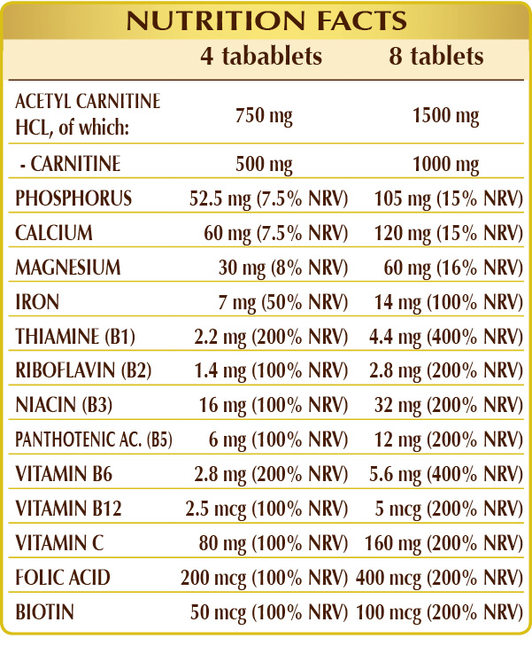 Acetyl (L-)carnitine HCL or hydrochloride, dibasic calcium phosphate, microcrystalline cellulose°, gum arabic°, vitamin C (ascorbic acid), ferrous gluconate, magnesium oxide, magnesium glycerophosphate, silicon dioxide°°, vitamin B3 (nicotinamide), plant-based magnesium stearate°°, vitamin B5 (calcium pantothenate), activated vitamin B6 (pyridoxal-5-phosphate), vitamin B1 (thiamine hydrochloride), activated vitamin B2 (riboflavin 5-phosphate sodium), activated folic acid (L-methylfolate calcium), biotin, activated vitamin B12 (5-deoxyadenosylcobalamin, methylcobalamin) °Bulking agent °°Anti-caking agent