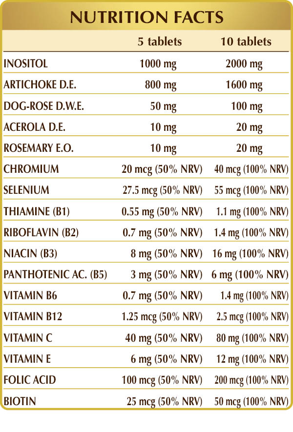 Myo-Inositol of plant origin (extracted from corn seeds), artichoke (Cynara scolymus) leaf D.E. (titrated to 5% chlorogenic acid), microcrystalline cellulose°, gum Arabic°, dog-rose (Rosa canina) fruit D.E. (titrated to 70% in vitamin C), silicon dioxide°°, natural-source vitamin E (D-α-tocopheryl acetate), plant-based magnesium stereate°°, acerola (Malpighia glabra) fruit D.E. (titrated to 50% in vitamin C), rosemary (Rosmarinus officinalis) leaf E.O., Vitamin B3 (niacinamide), Vitamin B5 (calcium pantothenate), Activated Vitamin B2 (riboflavin 5-phosphate sodium), Activated Vitamin B6 (pyridoxal-5-phosphate), Vitamin B1 (thiamine hydrochloride), Chromium picolinate, Activated Folic Acid (L-methylfolate calcium), Sodium selenite, Biotin, Activated Vitamin B12 (5-deoxyadenosylcobalamin, methylcobalamin). °Bulking agent °°Anti-caking agent