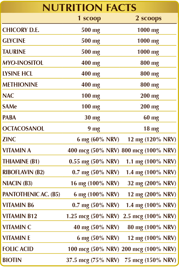 Corn or rice-derived maltodextrins, chicory (Cichorium intybus) root D.E. (standardized to 90% inulina), glycine, taurine, plant-derived myo-inositol (extracted from corn seeds), (L-)lysine HCl or hydrochloride, (L-)methionine, SAMe (S-adenosyl methionine disulfate tosylate), NAC (N-acetylcysteine), zinc gluconate, vitamin C (ascorbic acid), PABA (para-aminobenzoic acid), vitamin B3 (nicotinamide), policosanols from sugar cane (extract standardized to 60% octacosanol), plant-derived vitamin E (D-α-tocopheryl acetate); plant-based sweeteners: steviol glycosides from stevia, thaumatin; vitamin B5 (calcium pantothenate), vitamin A (retinyl acetate), activated vitamin B2 (riboflavin 5-phosphate sodium), activated vitamin B6 (pyridoxal-5-phosphate), vitamin B1 (thiamine hydrochloride), activated folic acid (L-methylfolate calcium), biotin, activated vitamin B12 (5-deoxyadenosylcobalamin, methylcobalamin).