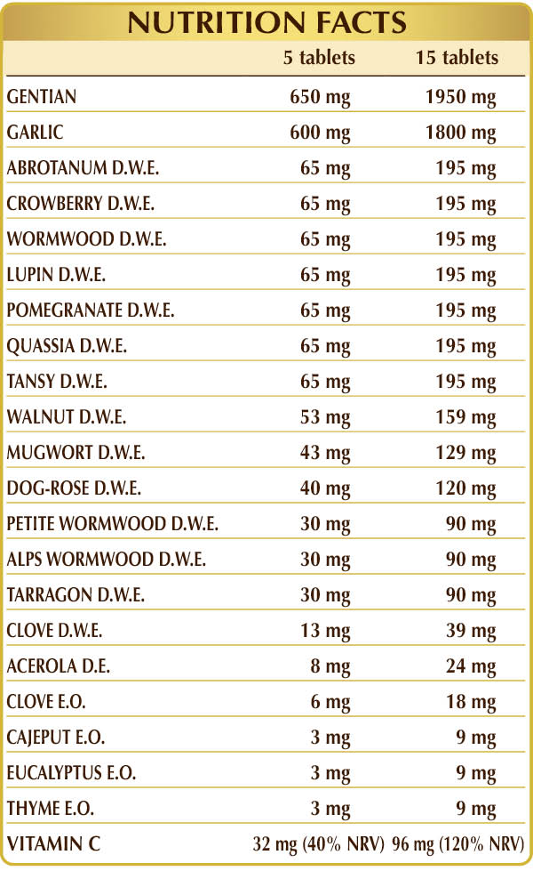 Wormwood, pomegranate, mugwort, tarragon, cloves and thyme promote regular gastrointestinal motility and, in combination with gentian, garlic, southernwood, bitter ash, tansy, cajeput, Petite and Alps wormwood, support the digestive function. Grande wormwood, mugwort, tarragon, cloves and thyme also promote gas relief, whereas vitamin C help support body's natural defence.