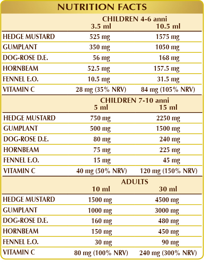 Grindelia (or gumplant) has a beneficial balsamic effect and, combined with hedge mustard, carries out an emollient and soothing action that helps you maintain healthy oropharyngeal mucous membranes and voice. Fennel, promoting the fluidity of the bronchial secretions, supports the beneficial action of gum plant and hedge mustard on the upper respiratory tract. Dog-rose, thanks to its high Vitamin C content, is useful in boosting and maintaining the body's immune system.