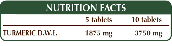 Turmeric (Curcuma longa) rhizome D.W.E., microcrystalline cellulose°, gum arabic°, silicon dioxide°°, vegetable magnesium stearate°°.