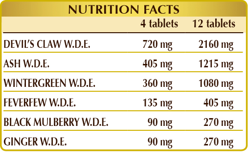Devil's claw (Harpagophytum procumbens) root W.D.E., ash (Fraxinus excelsior) leaf W.D.E., wintergreen (Gaultheria procumbens) leaf W.D.E., feverfew or chrysanthemum parthenium (Tanacetum parthenium) flowering herb W.D.E., microcrystalline cellulose°, gum arabic°, black mulberry (Morus nigra) leaf W.D.E., ginger (Zingiber officinale) rhizome W.D.E., silicon dioxide°°, plant-based magnesium stearate°°. °Bulking agent °°Anti-caking agent