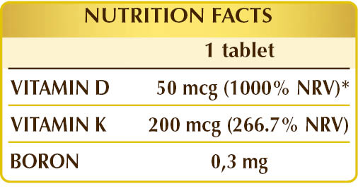 Vitamin D supplement enriched with boron and vitamin K2. Vitamin D contributes to calcium and phosphorus absorption, promoting healthy bones and teeth, helps maintain normal calcium levels in the blood, gets involved in the cell division process, supports the immune system and promotes muscle function. Vitamin K also contributes to normal blood clotting and helps keep normal bones.
