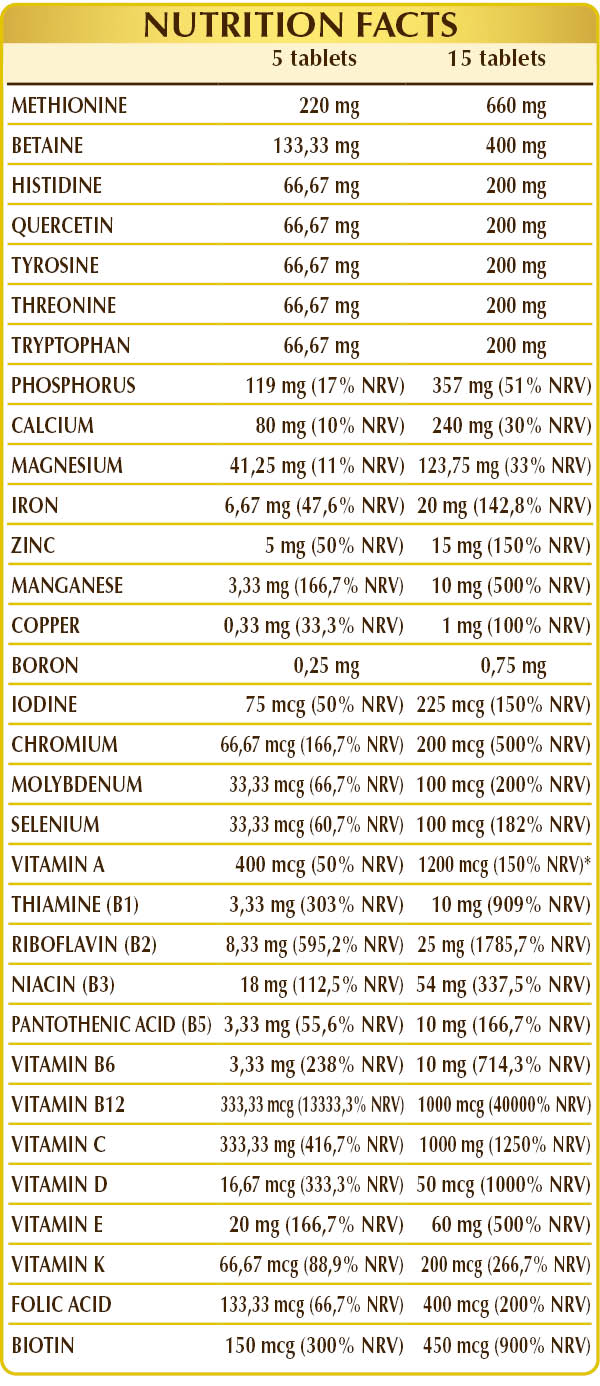 Dicalcium phosphate, magnesium glycerophosphate, vitamin C (ascorbic acid), microcrystalline cellulose°, gum arabic°, (L-)methionine, betaine, (L-)histidine, quercetin, (L-)tyrosine (from fermentation), (L-)threonine, (L-)tryptophan (from fermentation), ferrous gluconate, plant-based vitamin E (D-α-tocopheryl acetate), zinc gluconate, silicon dioxide°°, manganese gluconate, vitamin B3 (inositol hexanicotinate, nicotinamide), lichen (Cladonia rangiferina) thallus D.E. (standardized to Vitamin D3 Cholecalciferol 100,000 IU/g), activated Vitamin B2 (Riboflavin 5-phosphate sodium), activated Vitamin B6 (Pyridoxal-5-phosphate), plant-based magnesium stearate°°, Vitamin B1 (Thiamine hydrochloride), Vitamin B5 (Calcium pantothenate), Vitamin A (Retinyl acetate 500,000 IU/g), copper gluconate, sodium borate, chromium picolinate, activated Vitamin B12 (Methylcobalamin, 5-deoxyadenosylcobalamin), biotin, activated folic acid (Calcium L-methylfolate), potassium iodide, sodium molybdate, sodium selenite, Vitamin K1 (Phylloquinone), Vitamin K2 or MK-7 (Menaquinone) from Natto (fermented soybeans). D.E.= Dehydrated Extract °Bulking agent °°Anti-caking agent