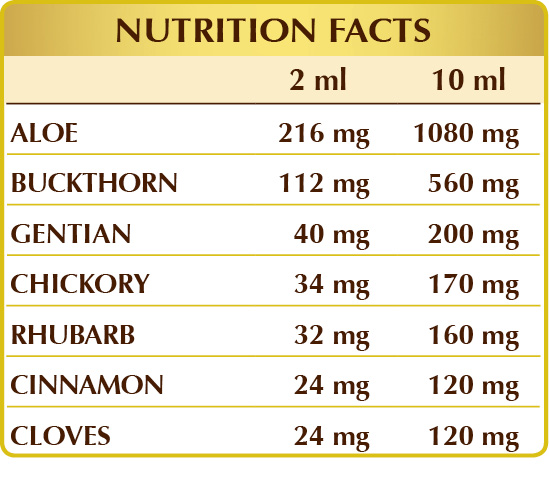 Bidistilled vegetable glycerine, pure water, aloe (Aloe vera) leaf sap or juice W.L.E., alder buckthorn (Rhamnus frangula) bark W.L.E., gentian (Gentiana lutea) roots W.L.E., chicory (Cichorium intybus) roots W.L.E., Chinese rhubarb (Rheum palmatum) rhizomes W.L.E., cinnamon (Cinnamomum zeylanicum) bark W.L.E., clove (Eugenia caryophyllata) flower bud W.L.E.
