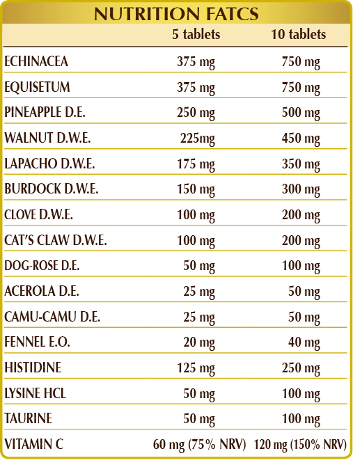 Food supplement made from herbs, amino acids and vitamin C. Coneflower and Lapacho promote body's natural defences. Vitamin C, naturally found in dog rose, acerola and camu-camu, contributes to a normally functioning immune system. Walnut, burdock and lapacho enhance the body's cleansing function whereas horsetail, pineapple and fennel encourage body fluid drainage.