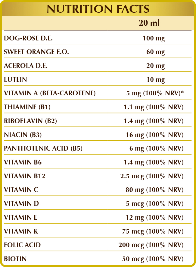 Vegetable bidistilled glycerine, pure water, marigold (Tagetes erecta) flower head D.E. (titrated to 5% lutein), dog-rose (Rosa canina) fruit D.E. (titrated to 70% Vitamin C); natural flavour: sweet orange (Citrus aurantium var. sinensis or dulcis) fruit peel E.O., xanthan gum, carrot (Daucus carota) root D.E. (titrated to 10% beta-carotene), vitamin E (Dl-α-tocopheryl acetate), acerola (Malpighia glabra) fruits (titrated to 50% vitamin C), vitamin B3 (nicotinamide), vitamin B5 (calcium pantothenate), vitamin D3 (cholecalciferol), vitamin B6 (pyridoxine), vitamin K1 (phylloquinone ), vitamin B2 (Thiamine hydrochloride), vitamin B1 (thiamine), folic acid, biotin, vitamin B12 (cyanocobalamin).