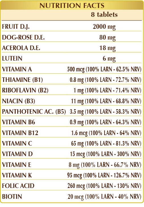 NRV = Nutrient Reference Value D.E.= Dehydrated Extract D.W.E. = Dry WholeExtract D.J. = Dehydrated Juice