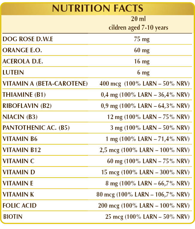 Vegetable bidistilled glycerine, pure water, marigold (Tagetes erecta) flower head D.E. (standardized to 5% lutein), ferrous gluconate, dog rose (Rosa canina) fruit W.D.E. (standardized to 70% vitamin C), zinc gluconate; natural flavor: sweet orange (Citrus aurantium var. sinensis or dulcis) fruit peels O.E.; xanthan gum, beta-carotene (standardized to 10%), vitamin E (DL-α-tocopheryl acetate), acerola (Malpighia glabra) fruit (standardized to 50% vitamin C), vitamin B3 (nicotinamide), manganese gluconate, vitamin D3 (cholecalciferol 100,000 IU/g), copper gluconate, vitamin B5 (calcium pantothenate), sodium borate, activated vitamin B2 (riboflavin 5’-phosphate sodium), activated vitamin B6 (pyridoxal-5’-phosphate), vitamin B1 (thiamine hydrochloride), activated folic acid (L-methylfolate calcium), potassium iodide, chromium picolinate, sodium selenite, vitamin K1 (phylloquinone), sodium molybdate, biotin, activated vitamin B12 (5-deoxyadenosylcobalamin, methylcobalamin).