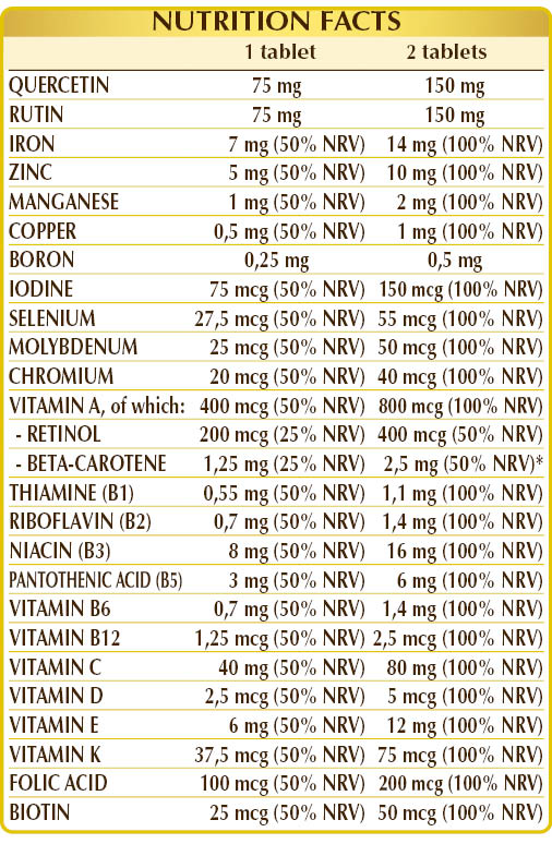 Multivitamin supplement containing 100% NRV of all vitamins, enriched with quercetin, rutin, and 100% NRV of all trace elements. In particular, vitamins B2, C, E with manganese, copper, selenium, and zinc contribute to protecting cells from oxidative stress, while vitamins A, B6, B12, C, D, and folic acid together with iron, copper, selenium, and zinc support the normal function of the immune system. Moreover, vitamins B1, B2, B3, B6, B12, C, and biotin with iodine and copper help maintain normal nervous system function, while vitamins D and K with manganese and zinc aid in maintaining normal bones. Finally, vitamins B2, A, and zinc support healthy vision, while vitamins B1, B2, B3, B5, B6, B12, C, and biotin together with iron, iodine, manganese, and copper contribute to normal energy metabolism.