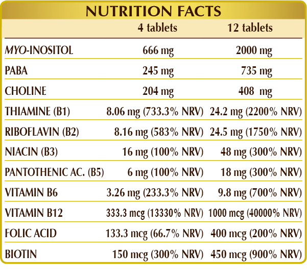 A food supplement containing all the B-group vitamins and other nutritive and physiological substances such as inositol, PABA, and choline. Vitamins B6 and B12 promote normal formation of red blood cells and, combined with vitamins B2, B3, B5, C and folic acid, they can help relieve tiredness and fatigue. Vitamins B1, B3, B6, B12, and biotin promote nervous system function and, combined with folic acid, are beneficial for maintaining normal psychological function. Folic acid and vitamins B6 and B12 also contribute to a normally functioning immune system. Biotin promotes healthy hair and, combined with vitamins A, B2, B3 and C, helps maintain skin health. Finally, vitamin B2 contributes to maintaining normal vision. In addition, choline contributes to normal homocysteine and lipid metabolism and supports healthy liver function.