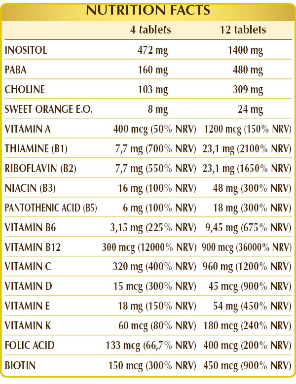 Food supplement containing all the vitamins and other substances with nutritional and physiological benefit such as inositol, PABA and choline. Vitamins B6 and B12 promote normal formation of red blood cells and, combined with vitamins B2, B3, B5, C and folic acid, they can help relieve tiredness and fatigue. Vitamins B1, B3, B6, B12 and biotin contribute to a healthy and normally functioning nervous system and, combined with folic acid, can help maintain normal psychological function. Vitamins A, B6, B12, C and folic acid also contribute to the normal function of the immune system. Biotin promotes healthy hair and, combined with vitamins A, B2, B3 and C, helps maintain skin health. Vitamins D and K contribute to keeping normal bones whereas vitamins A and B2 promote normal vision. Finally, vitamin B2, C and E protect cells from oxidative stress. In addition, choline contributes to normal homocysteine and lipid metabolism and supports healthy liver function.