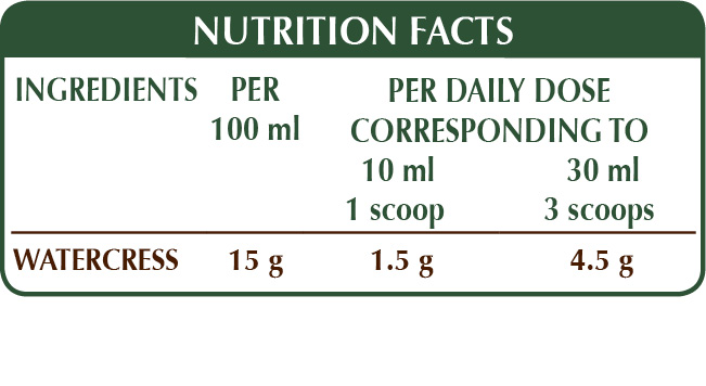 Alcohol-free whole liquid extract obtained from: bi-distilled vegetable glycerine, pure water, watercress (Nasturtium officinale) herb.