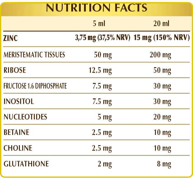 Bidistilled vegetable glycerine, pure water; fresh meristematic tissues (1%): oak (Quercus peduncolata or Quercus robur) buds, walnut (Juglans regia) buds, raspberry (Rubus idaeus) young shoots, horse chestnut (Aesculus hippocastanum) (AESCIN) buds; zinc gluconate, ribose, 1.6-diphosphate fructose; acidity regulator: citric acid; inositol, betaine citrate, tartrate choline; nucleotide blend: AMP (adenosine monophosphate), CMP (cytosine monophosphate), GMP (guanosine monophosphate), UMP (uridine monophosphate); glutathione; natural sweetener: thaumatin (E957). With natural sweeteners.