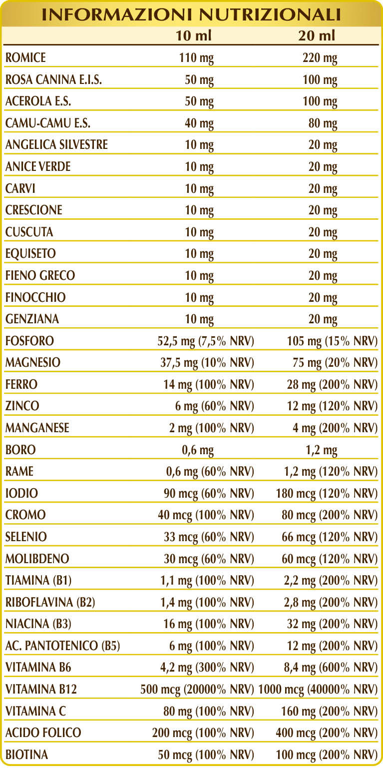 Glicerina vegetal bidestilada, agua pura, glicerofosfato de magnesio, lengua de vaca (Rumex crispus) raíces E.I.L., citrato férrico de amonio; corrector de acidez: ácido cítrico y ácido fosfórico; rosal silvestre (Rosa canina) frutos E.S. (titulado al 70 % en vitamina C), acerola (Malpighia glabra) frutos E.S. (titulado al 50 % en vitamina C), gluconato de zinc; camu-camu (Myrciaria dubia) frutos (titulado al 50 % en vitamina C), gluconato de manganeso, vitamina B3 (nicotinamida), angélica silvestre (Angelica sylvestris) raíces E.I.L., anís verde (Pimpinella anisum) frutos E.I.L., alcaravea (Carum carvi) frutos E.I.L., berro (Nasturtium officinale) hierba E.I.L., cuscuta (Cuscuta epithymum) hierba E.I.L., cola de caballo (Equisetum arvense) hierba E.I.L., fenogreco (Trigonella foenum-graecum) semillas E.I.L., hinojo (Foeniculum vulgare) frutos E.I.L., genciana (Gentiana lutea) raíces E.I.L.; edulcorantes de origen natural: glicosidos de estaviól de stevia, taumatina; vitamina B5 (pantotenato de calcio), vitamina B6 activada (piridoxal-5-fosfato), borato de sodio, vitamina B2 activada (riboflavina 5-fosfato sódico), gluconato de cobre, vitamina B1 (clorhidrato de tiamina), vitamina B12 activada (5-desoxiadenosilcobalamina, metilcobalamina), cloruro de cromo, ácido fólico activado (L-metilfolato de calcio), yoduro de potasio, molibdato de sodio, selenito de sodio, biotina.