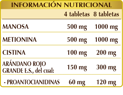 Complemento alimenticio de manosa, aminoácidos (metionina y cistina) y extracto de arándano rojo grande. Este último, también conocido como arándano rojo americano o cranberry, favorece el drenaje de los líquidos corporales y ayuda a tonificar las vías urinarias, además de ejercer una beneficiosa acción antioxidante.
