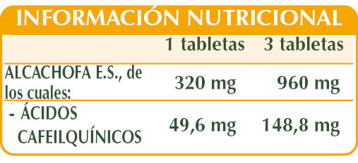 Complemento alimenticio a base de extracto seco de alcachofa, fuente natural de derivados del ácido cafeico conocidos como ácidos cafeilquínicos, entre los cuales se encuentra el ácido clorogénico. Gracias a su acción, la alcachofa ayuda a favorecer la función hepática y depurativa del organismo. Además, tiene una acción antioxidante, promueve el metabolismo de los lípidos y estimula la función digestiva.