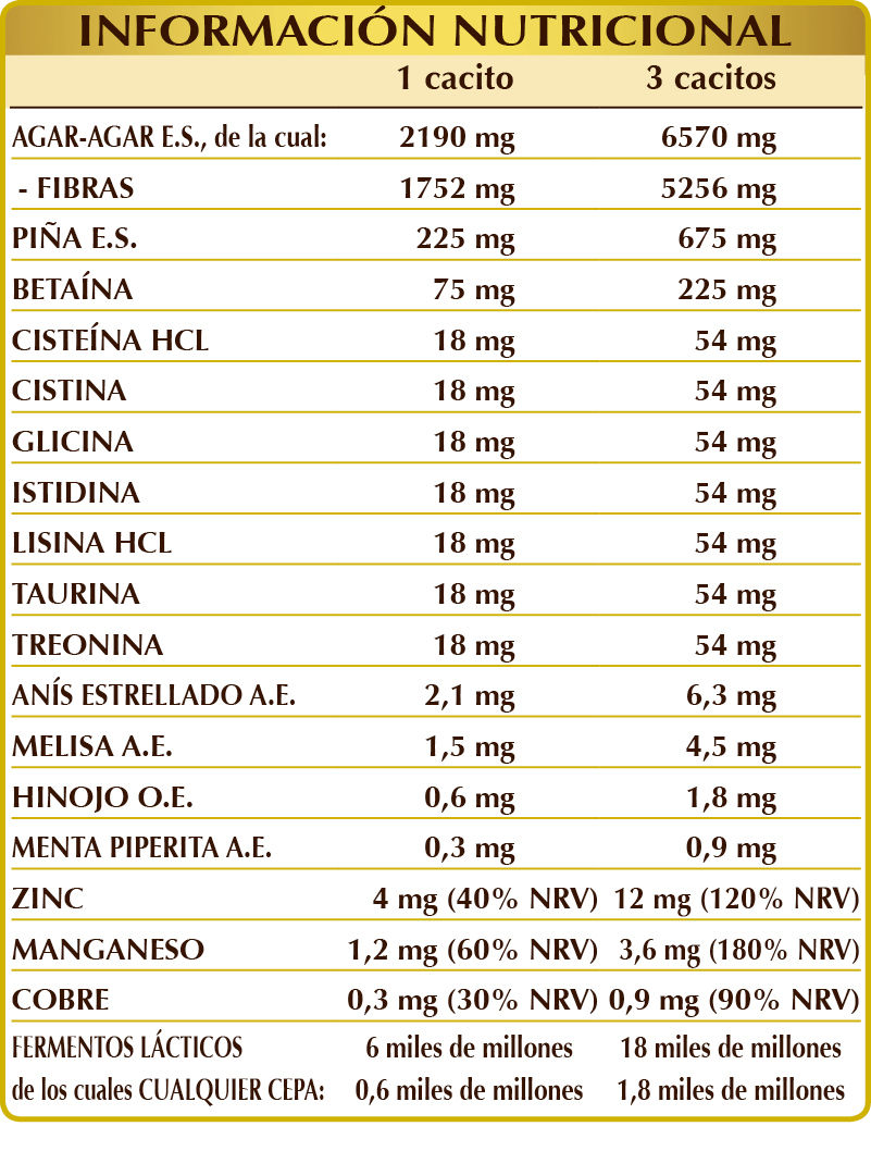 Agar-agar (Gelidium amansii) talo (alga) E.S., maltodextrinas de maíz o arroz, piña (Ananas comosus) tallos de los frutos E.S. (bromelina 2500 GDU/g), betaína HCL o clorhidrato, mezcla de fermentos lácticos (titulada al 10 % en cada una de las siguientes cepas: Bifidobacterium bifidum SD5215, breve SD5206, lactis SD5219; Lactobacillus acidophilus SD5212, brevis SD5214, bulgaricus SD5589, casei SD5213, paracasei SD5275, plantarum SD5209, rhamnosus SD5217), gluconato de zinc, (L-)cisteína HCL o clorhidrato, (L-)cistina, glicina, (L-)histidina, (L-)lisina HCL o clorhidrato, taurina, (L-)treonina, gluconato de manganeso, gluconato de cobre, anís estrellado (Illicium verum) frutos A.E., melisa (Melissa officinalis) hojas A.E.; edulcorantes de origen natural: glucósidos de esteviol, taumatina; hinojo (Foeniculum vulgare) frutos A.E., menta piperita (Mentha piperita) hojas A.E.