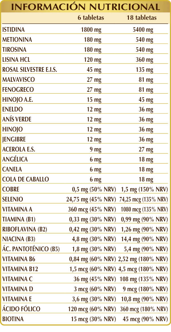 (L-)histidina, celulosa microcristalina°, goma arábiga°, (L-)metionina, (L-)tirosina, (L-)lisina HCL o clorhidrato, rosal silvestre (Rosa canina) frutos E.I.S. (titulado al 70 % en vitamina C), dióxido de silicio°°, malvavisco (Althaea officinalis) raíces Plv, fenogreco (Trigonella foenum-graecum) semillas Plv, hinojo (Foeniculum vulgare) frutos A.E., estearato de magnesio de origen vegetal°°, eneldo (Anethum graveolens) frutos Plv, anís verde (Pimpinella anisum) frutos Plv, hinojo (Foeniculum vulgare) frutos Plv, jengibre (Zingiber officinalis) rizomas Plv, acerola (Malpighia glabra) frutos E.S. (titulado al 50 % en vitamina C), vitamina E de origen vegetal (acetato de D-α-tocoferol), angélica (Angelica archangelica) raíces Plv, canela (Cinnamomum zeylanicum) cortezas Plv, cola de caballo (Equisetum arvense) hierba Plv, vitamina B3 (nicotinamida), vitamina A (acetato de retinol), sulfato de cobre, vitamina B5 (pantotenato de calcio), vitamina B6 activada (piridoxal-5-fosfato), liquen de los renos (Cladonia rangiferina) talo E.S. (titulado en vitamina D3 colecalciferol 100 000 UI/g), vitamina B6 activada (piridoxal-5-fosfato), vitamina B1 (clorhidrato de tiamina), ácido fólico activado (L-metilfolato de calcio), selenito de sodio, biotina, vitamina B12 activada (5-desoxiadenosilcobalamina, metilcobalamina).